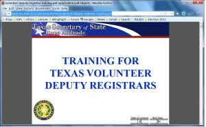 The Texas Secretary of State’s office has published training on-line, here. I wonder why this couldn’t be used as actual “online” training for past VDR’s or at least for those of us who are residents of the County?