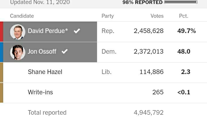 (Each race had several candidates and Georgia requires a majority to win. Republican John Purdue beat Democrat Jon Ossof 49.7% to 48%.