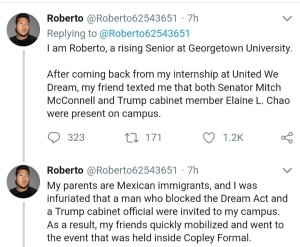 She confronted them right back. Watch the video posted by one of the harassers, “Roberto6254351,” a self-proclimed “rising Senior ” (sic), who had just left his job as an intern at “United We Dream,” an organization devoted to activism for the undocumented.