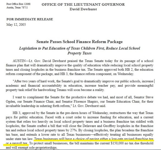 Another claim – currently seen in Cruz’ TV ads – is that Dewhurst “actively supported” a “payroll tax” during this process. Cruz cherry picks two words from a Press Release issued by the Dewhurst staff in 2006. One Senate version of the franchise tax rework praised the Senate for passing a bill that included School finance and the business tax changes. The term is only used once, in paragraph 4 and is not actually in the Bill. There are quotes around the statements by Dewhurst, but no quotes are found in the part that uses the words “payroll tax.” The Press Release notes that businesses had the option to choose between the two ways to calculate that tax, one based on income alone and one adjusted by employees payroll with exemptions, but doesn’t advocate one way over the other. (That version never passed into law.)