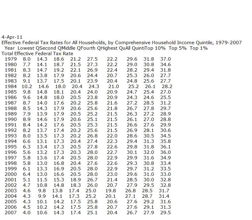 A very interesting set of tables showing relative tax rates for households from the ’70’s to 2007.